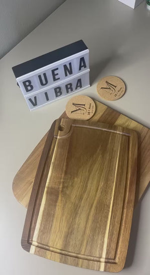 2) Acacia Cutting Board with Juice Groove: the wooden cutting board is surrounded by a juice groove that perfectly collects excess liquid while you prepare dishes without spilling onto the countertop. Size: 14" x 10" x 0.6"
